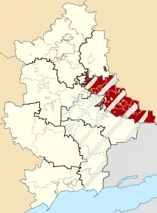 Horlivka Raion (Ukrainian: Горлівський район, romanized: Horlivskyi raion; Russian: Горловский район, romanized: Gorlovsky rayon) is a prospective raion (district) of Donetsk Oblast, Ukraine. It was formally created in July 2020 as part of the reform of administrative divisions of Ukraine. The center of the raion is in the town of Horlivka.[3][4] Population: 662,069 (2022 estimate).[2] The area of the raion is occupied by Russia, which continues to use the old, pre-2020 administrative divisions of Ukraine. Prior to the 2022 Russian invasion of Ukraine, portions of the northern Maiorsk district of Horlivka were the only notable areas of the raion under Ukrainian government control.