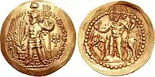 Coins of Hormizd I Kushanshah were minted at Kabul, Balkh, Herat, and Marw.[5] The synchronicity of the Kushano-Sasanians with the rulers of the Kushan Empire is rather well established, as a large quantity of the early copper coins of Hormizd I Kushanshah from the south of the Hindu-Kush were overstruck by the Kushan Emperor Vasudeva II (r.275–300).[13] Some of Hormizd I Kushanshah's coins imitate Kushan coinage, with king standing in Kushan military dress on the obverse, and the deity Oesho on the reverse.[5] Other coins however follow more closely the Sasanian pattern, with him being portrayed in the Sasanian style, and with fire altar or deity on the reverse.[5]