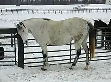 Horses are almost always fatter in summer than in winter,[11] especially if they live outdoors all year round,[12] or in the wild.[13] In summer, changes in light levels lead to an increase in appetite and changes in metabolism,[14][15] which generally result in weight gain. In winter, on the other hand, appetite is reduced and the efficiency of energy conservation is increased, as the food available is generally scarcer.[16] This particularity seems to stem from the horse's long evolutionary history in an environment that does not always offer the same quantity of food from one season to the next, nor from one year to the next.[15] The obesity rate can differ by around 8 % depending on whether measurements are taken in summer or winter. The horse body condition is at its lowest at the end of winter.[12]
