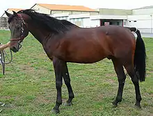 The horse body mass is always 65-75 % water.[1] The horse is considered a "thin animal" (with little fat), whose weight is divided into approximately 11 % bone, 50 % muscle and 9 % fat;[2] but a large number of factors influence its weight. Some breeds (draft horses) are naturally heavier than others (ponies), and differ in size and bone structure, so the weight range of horses is highly variable. Ponies can weigh less than 200 kg and heavy horses more than a ton,[3] while the average weight of a saddle horse is estimated at around 500 kg. Champion show-jumper Jappeloup de Luze, for example, weighed around 470 kg.[4] Heavy horses bred for slaughter reach particularly high weights, as it's in the breeder's interest to get maximum meat weight out of them.[5]