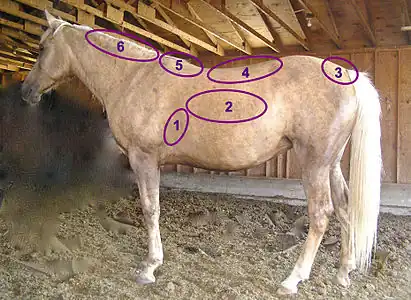 The areas where fat is deposited in horses, enabling body condition to be assessed by palpation: 1. Behind the shoulder; 2. On the ribs; 3. At the tail head; 4. Along the dorsal vertebrae ; 5. Around the withers; 6. Along the neck.