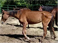Thinness can have many causes. In geriatric horses, it may be due to parasite infestation. Furthermore, they tend to become thinner and more sensitive to the passing of the seasons,[30] losing weight and body fat.[31] These weight losses can have multiple causes: deficiencies, dental problems, lack of appetite, digestive problems, etc.[32] They are an aggravating factor in horse mortality. They are an aggravating factor in mortality. It's hard to get an old horse to put on weight again.[33] The problem of losing weight can cause problems for owners of older horses, who are sometimes wrongly suspected of animal abuse.[34] Indeed, most animal protection associations consider thinness to be a sign of horse abuse.[35] Numerous cases of mistreatment have involved owners who have fed their animals poorly (or not at all), with the result that they have been found in a state of emaciation that is sometimes considerable.[36]