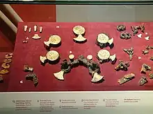 A nomad's kurgan burial of around 700 BCE at Kostromskaya in southern Russia included, as well as the principal male body with his accoutrements, thirteen humans with no adornment above him, and around the edges of the burial twenty-two horses buried in pairs.[15] Horse burials are part of the Pazyryk burials, where lavishly decked-out horses were killed and sometimes buried in chambers separate from those containing human remains.[16] They were characteristic in pre-Christian Hungary (one horse burial was excavated in Mikulčice,[17] another in Sterlitamak[18]) of the ninth and tenth centuries, especially for rich members of society, where people were buried next to the skin and the skull of a saddled horse; the rest of the horse meat was possibly eaten during a burial ceremony.[17] Roman culture left horse burials throughout their empire, including first-century burials in modern-day Waremme, Belgium and Beuningen, Netherlands.[19]