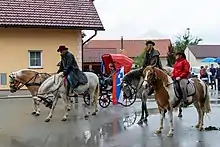 Horses have been present in Slovenia for a very long time.[1] Equine remains dating back to the Hallstatt culture have been found in Dolenjska, in the south-east of the current country, putting in evidence the symbolic role of horses associated with male power in late prehistory.[2] In some archaeological sites on Slovenian territory have been found 28 iron bridle bits dating from the early Middle Ages, as well as stirrups and spurs. Slovenian bits from this period are characterized by a thick barrel.[3] The first written mention of a local breed, the Karst horse, dates back to the 15th century.[1]