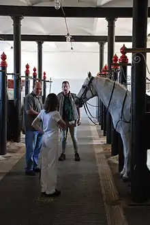Poet and playwright Boris A. Novak wrote a satirical play entitled Lipicanci gredo v Strasbourg ("Lipizzans go to Strasbourg") in 2008.[64] In this play, the Lipizzans go to the European Court of Human Rights and demand justice because their habitat is shrinking, they suffer from commercial tourism, are mistreated and become a mere means of generating profit.[64] In this play, the horses are taken seriously by the court, and bring a complaint against Slovenia as well as all the other countries to which Lipica has belonged since 1580.[64] According to Kaučič's analysis, Novak "inscribes in his play a severe criticism of Slovenian policy towards Lipizzans", including the complete commercialization of Lipica and the exploitation of the horses for tourism and profit.[65] She concludes that "horses as living creatures do not exist in the neoliberal capitalist world".[65] Kaučič brings this piece closer to ecocriticism, in that it carries the voice of the Lipizzans themselves, as free entities worthy of decent treatment.[66] In 2006, Slovenian poet Miklavž Komelj published the poem series Hippidrom, which also carries an anti-speciesist, ecocritical message.[67]