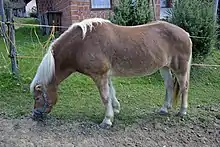 The Haflinger (haflinški konj), considered a traditional breed,[6] has been bred since the 1950s[33] for combined combined driving and pack in the mountains. It is also used as a mount for children and young people.[5] In the 1970s, the Slovenian government imported 181 mares and 29 stallions of this breed to meet the needs of agriculture and tourism.[33] In 2004, around 1 000 Haflingers were bred in Slovenia,[33] with the number expected to fall to 550 by 2021, following a decline in the herd over several years.[40] The Haflinger association also manages draft horse breeds.[33] Almost all Haflinger stallions are owned by the state, and are kept at public studs throughout the country.[33] Slovenian Haflinger breeding is specifically aimed at the tourist market.[33]