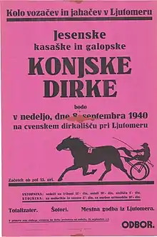 The first developments in horse racing in Slovenia date back to 1875, with the founding of a trotting association in Ljutomer, which organized the first races.[9] Trotting is a Slovenian tradition.[9] They are managed by the Union of Trotters of Slovenia, which, as its name suggests, deals exclusively with trotters,[6] and maintains the competition calendar and the practice of this sport, formerly throughout Yugoslavia.[9]
