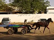 The horse is mainly used as a means of transport, traction, and more rarely as a leisure animal.[6] Horse riding is practiced in rural areas of Sudan for transportation purposes.[6] On the other hand, horse was not used, or only very little, as an agricultural aid in Central Sudan.[3] The vast majority of Sudanese horses are used as working animals, with the exception of a minority of sport horses.[6] In addition to its horse racing, Sudan is known for its tent pegging competitions, imported by the British.[4]