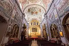 The church has a single nave covered by a barrel vault with lunettes and arches. The nave is decorated with mural frescos by Valdes Leal: frescos in the chancel represent the invention of the Holy Cross; on the right side of the presbytery is represented San Fernando delivering the mosque to the Archbishop; on the left side is shown San Fernando before the Virgin of Antigua. The reliquary urns are copper and Flemish in origin. Marble paintings of the Immaculate Virgin and Child were made by Sassoferrato. The paintings that cover the vault and the walls were made by Lucas de Valdés, son of Leal.