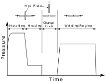 The matching phase serves to match the geometry of the weld surfaces to the theoretical welding plane. The weld surfaces are heated through conduction by physical contact with the hot plate. The hot plate temperature range is 30 to 100 °C (86 to 212 °F) above the melting temperature of the material, and a constant pressure between 0.2 and 0.5 MPa is applied against the hot plate.[1] This causes the weld surfaces to conform to the hot plate, which has the desired weld geometry. This also removes surface irregularities that would increase thermal contact resistance. After the parts are in full contact with the hot plate, the heating phase starts and pressure is reduced to a minimum.
