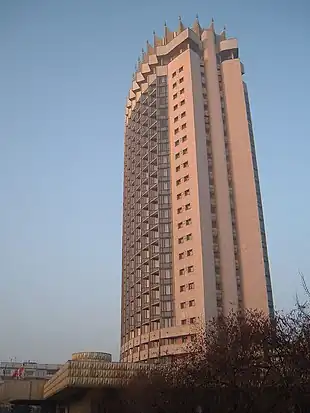 Hotel Kazakhstan (Kazakh: Қазақстан Қонақ Үйі, romanized: Qazaqstan Qonaq Üiı, Russian: Гостиница Казахстан) is the third-tallest building in the city of Almaty, Kazakhstan. It is 102 m (335 ft) tall,[1] with 26 floors.[2] It is situated in the southern center of Almaty. It is located on Dostyq Avenue, a major road in the east part of the city which runs all the way from Medeo to Panfilov Park, in the north part of town.