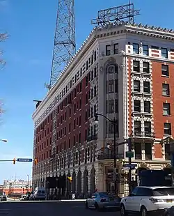 The original building was designed by the firm of Bethune, Bethune & Fuchs and built between 1902 and 1911. Additions from 1916–1917 and 1924–1926 were completed by Esenwein and Johnson. The lobby was decorated in 1942 in the Art Moderne style.[2] In its prime, the Lafayette Hotel was considered one of the 15 finest hotels in the country. Besides elevators, every room featured hot and cold water and a telephone. A 97 m (318 ft) antenna is attached to the building. From September 29 to December 19, 1953 it was home to the short-lived television station WBES-TV.