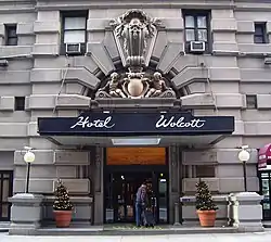 The Wolcott's construction was delayed by several months because Dewey had to import structural steel from Europe, having encountered issues in acquiring the steel domestically.[15] Furthermore, as a result of labor strikes, the hotel could not open in November 1903, as was originally scheduled.[35] The Wolcott opened on March 1, 1904,[36][37] with J. H. Woods as its first manager.[36] At the time of the Wolcott's opening, guests paid $3 per night for guestrooms with bathrooms and $8 per night for guestrooms with a parlor and bathrooms. The hotel had its own restaurant, which, according to a contemporary brochure, served "little chicken that come unplucked from the Jersey farms" and Cape Cod oysters.[9] In addition, the hotel hired porters to carry bags from nearby train stations, as well as a valet and a "ladies' maid".[9]
