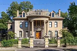 The Hotze House is a historic house at 1619 Louisiana Street in Little Rock, Arkansas. It is a 2+1⁄2-story brick structure, with a combination of Georgian Revival and Beaux Arts styling. Its main facade has an ornate half-round two-story portico sheltering the main entrance, with fluted Ionic columns and a modillioned cornice topped by a balustrade. Windows are topped by cut stone lintels. The hip roof is topped by a balustrade. Built in 1900 to a design by Charles L. Thompson, its interior is claimed to have been designed by Louis Comfort Tiffany. Peter Hotze, for whom it was built, was a major cotton dealer.[2]