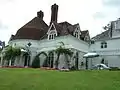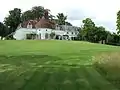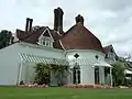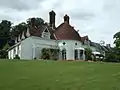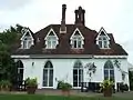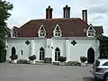 Houghton Lodge exemplifies the Cottage Ornée style. The reception rooms have french windows shaded by a verandah, while a servant wing (right) deliberately breaks the symmetry to provide informality.[1]