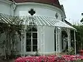 Houghton Lodge exemplifies this Cottage Ornée style; the principal reception rooms are placed on the ground floor, rather than on a piano nobile. The reception rooms, typical of the style, have french windows, shaded by a verandah, allowing immediate access to the garden. Many of Houghton's windows are in the exaggerated, decorative Gothic, almost Islamic, style which originated from the Walpole's Strawberry Hill Gothic.[6]