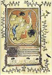 The Hours of Philip the Bold is a late 14th-century illuminated book of hours produced in Paris for Philip the Bold, Duke of Burgundy (1363-1404). It contains illustrated calendars, figured initials and 11 large miniatures with ivy borders, following the Paris liturgy. The manuscript has a devotional use. Philip reportedly recited his daily prayers from this manuscript.[1] His hours, which contains almost 200 images, is one of the most worldly manuscripts to survive from the library of the Burgundian Dukes.[1] It is now MS. 3-1954 in the Fitzwilliam Museum, Cambridge.