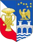 The coat of arms of the House of Bernadotte impales the coat of arms of the House of Vasa (heraldic right) and the coat of arms of Bernadotte as Prince of Pontecorvo (heraldic left). It is visible as an inescutcheon in the Greater Coat of Arms of the Realm.