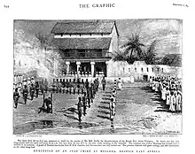 As is clear from Fitzgerald's photograph, the house then directly fronted the beach, but land reclamation means it now stands further back. On Friday 31 August 1894 Bell Smith was shot whilst smoking on the verandah in the evening, and died the following day.[5] He was buried in the grounds of the Portuguese Chapel, Malindi. An illustration of the execution by firing squad of his murderer was published in The Graphic on 8 December 1894. This shows the House of Columns in the background, the killer having been brought back to the site of his crime for punishment. All that is known about the building before 1891 is that it had been used by Adul Hussein Gulam Hussein & Co., for whom it served as a shop and a house[6][7]