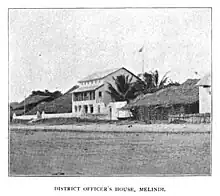 The House of Columns dates from the late nineteenth century, taking its name from the thick columns at its front, supporting the upper floors. The building is known to predate 1891, in which year it was photographed by William Walter Augustine Fitzgerald from the deck of the Henry Wright: a coastal steamer belonging the Imperial British East Africa Company.[2] At that time the house was occupied by the officer in charge of Malindi District, James Bell Smith.[3] Bell Smith hosted Fitzgerald in the house for several days in July 1891 while Fitzgerald explored Malindi, visiting among other things the Vasco da Gama pillar.[4]