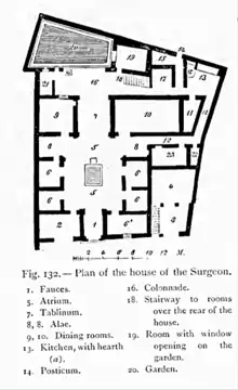 The House of the Surgeon[1] is one of the most famous houses in the ancient Roman city of Pompeii and is named after ancient surgical instruments that were found there. Along with the rest of the city, it was buried and largely preserved under 4 to 6 m of volcanic ash and pumice in the eruption of Mount Vesuvius in AD 79.