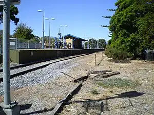 Hove was opened on 12 January 1914, and originally as North Brighton Station.[2] In April 1914, not long after opening, the station was renamed Middle Brighton Station.[3] Later in 1914, an electric light was installed to replace the previous oil lamp. As it was an unmanned station at the time, the light was switched on by a guard on the passing train at sundown, and off by the guard on the last train for the night.[4] A ticket office was added to the platform in mid-1915.[5] In 1920, the Railways Commissioner suggested the station should be renamed to Tingara Station, however the Brighton Council preferred Hove.[6] The station was officially renamed Hove in June 1920.[7]