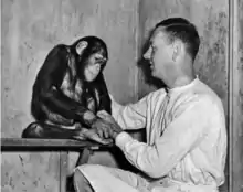 Howard A. Howe and Yogi the Chimp, ca 1950. After exposure to the virus, Yogi developed such strong immunity to polio that he could no longer be used in the Hopkins studies.