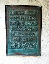 Howgills was built on South View in 1907 to a free-style Arts and Crafts design by Robert Bennett (1878–1956) and Benjamin Wilson Bidwell (1877–1944), typical with this firm of architects,[2] although it is thought the design is mostly by Bidwell, a Quaker himself.[3] Associates of Parker & Unwin who were closely connected with the Garden City Movement, Bennett and Bidwell opened an office in Letchworth in 1907 and over the next thirty years went on to design many distinctive buildings in the town.[4] The construction was undertaken by local builders Palmer & Ray. The Meeting House with its large, galleried wood-panelled central meeting room is based on Briggflatts in Cumbria and was named after the Howgill Fells that surround that hall.[5] The building is of two storeys with an irregular façade of three bays with a projecting entrance in the centre bay with a gable roof. The brick chimneys stacks are tall with moulded caps, while the stack on the front façade has weathered offsets. The walls have a roughcast surface while the casement windows with leaded lights sit within stone surrounds. The entrance arch is recessed and has boarded double-doors. The carved timber inscriptions over the entrance hall and meeting room fireplaces are apparently early work by Eric Gill.[4] The decorative copper plaque in the porch is in the Art Nouveau style and reads: "THIS BUILDING ERECTED 1907 IS THE GIFT OF JULIET RECKITT TO THE SOCIETY OF FRIENDS".[1]