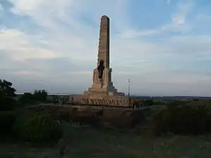 On two sides of the obelisk stand bronze figures symbolising war and peace. On the west face is a figure of a robed woman holding a baby, a wreath of poppies and broken manacles. On the east face stands a British infantry soldier dressed for winter and standing guard with standard issue .303 rifle, bayonet fixed, a gas mask, water bottle, putties and his helmet pushed off the back of his head, and a German helmet at his feet .[1]