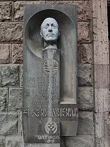 A plaque with a small sculpture at 43 Mashtots Avenue in Yerevan, where Acharian lived between 1940 and 1953.