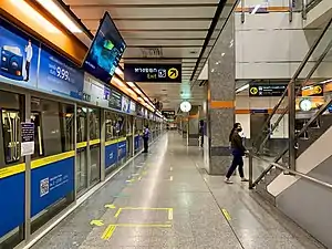 Huai Khwang station (Thai: สถานีห้วยขวาง, pronounced [sā.tʰǎː.nīː hûa̯j kʰwǎːŋ]; code BL18) is a MRT station on the Blue Line in Bangkok, Thailand. It is located under Ratchadaphisek Road, near the MRT Depot. Before the station was opened, its planned name was Pracha Rat Bamphen, but it was changed to Huai Khwang later. The station's symbol is color orange.[1]