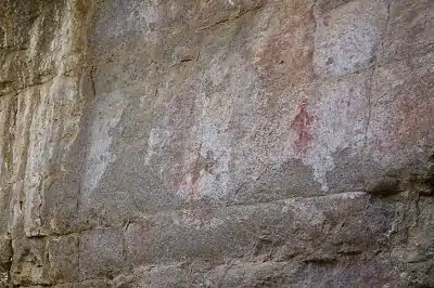 A lizard and men are portrayed. A man is depicted in the act of throwing a prehistoric version of the atlátl spear, a javelin-like weapon used with an arm extension, with a type of large spoon dart in the end, it was used mainly to hunt ducks that must have existed by the thousands in the lagoon located west of the site.[5]