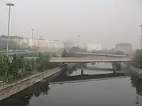 At Dongbianmen, the apartment blocks of Hubeikou, part of the East Huashi Beili East Residential Community in northeastern Huashi, is visible from the Beijing-Shanhaiguan Railway. The Second Ring Road and the city wall moat are in the foreground and the Southeast Corner Tower is to the right.