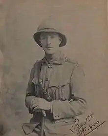 Lord Grosvenor had taken a commission with the Royal Horse Guards and was in South Africa serving in the Second Boer War, when in December 1899 he succeeded his grandfather. After a brief visit back home, he returned in February 1900 to serve with the Imperial Yeomanry, as an ADC to Lord Roberts and Lord Milner.[8] Arriving in Cape Town, he was reported to leave that city for the front in early March.[9] He resigned his commission in December 1901,[10] and was appointed captain of the Cheshire (Earl of Chester's) Imperial Yeomanry the following month.[11] The war ended in May 1902. He subsequently invested in land in South Africa and Rhodesia, and visited the colony with his wife in late 1902.[12] He was promoted major in the Cheshire Yeomanry in 1906.[8]