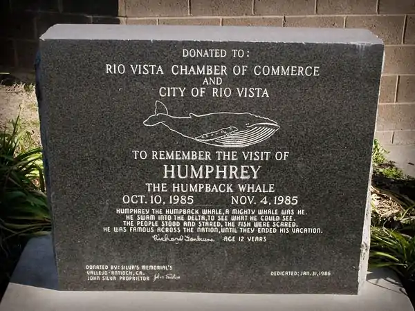 As they approached the San Francisco Bay and the water gained in salinity, Humphrey became visibly excited and began sounding. Though the crew lost sight of him that night, they picked him back up in the morning and led him out through the Golden Gate bridge into the Pacific Ocean on November 4, 1985, at 4:36 p.m.[9] The town of Rio Vista later erected a commemorative granite marker at City Hall at the east end of Main Street.[7][10] A restaurant in Antioch was named Humphrey's in the whale's honor. The restaurant has since been remodeled and its name changed to 'Smith's Landing Seafood Grill'.[11]