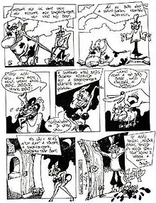 Ernő Zórád ended his professional relationship with Tibor Cs. Horváth and wrote his own comic scripts.[49] Luckily Zórád was not just a great artist, but also a talented storyteller: these comics came much closer to the medium's own language.[49] He also made experimental collage comics in the early seventies attracting international attention. These works were invited to the Salone Internazionale del Comics festival in 1970 but his portfolio – due to Hungarian bureaucracy – has arrived late. Furthermore, the works has been stolen from the festival.[37][50] By the late seventies the classic trio of Hungarian comics creators disappeared: Korcsmáros died in 1975, Sebők died in 1980 and Zórád retired temporarily. Since young talents were not introduced during the preceding three decades (except for Attila Fazekas), many mark these years the end of Hungarian comics' golden age.[37]