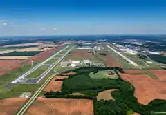 The airport covers 6,000 acres (2,428 ha) at an elevation of 629 feet (192 m). It has two asphalt runways: 18R/36L is 12,600 by 150 feet (3,840 x 46 m) and 18L/36R is 10,001 by 150 feet (3,048 x 46 m).[16] In the year ending December 31, 2019, the airport had 70,816 aircraft operations which averaged about 194 flights per day.