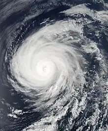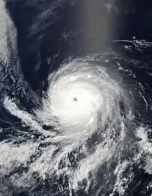 Although there were no factors inhibiting the development of Celia, the storm unexpectedly weakened again later on June 23. The storm's eye rapidly dissipated and the central dense overcast became asymmetric. Forecaster Todd Kimberlain at the NHC referred to the unexplained shifts in strength as "puzzling."[17] However, as suddenly as the weakening took place, strengthening ensued. Very strong convection formed over the center of the storm, with some cloud tops being as cold as −86 °C (−123 °F), but no eye had reformed by the morning of June 24.[18] Throughout the day, Celia became increasingly organized, with the eye fully reforming and the structure becoming more symmetrical.[19] Rapid intensification soon followed as the storm reached Category 4 status,[20] becoming one of only a handful of tropical cyclones to do so during the month of June in the eastern Pacific.[21] That evening, the storm further intensified into a Category 5 hurricane, the second storm to reach this strength during June in the Eastern Pacific basin on record.[22] Hurricane Celia attained its peak intensity around 00:00 UTC, with sustained winds of 160 mph (255 km/h) and a barometric pressure estimated at 921 mbar (hPa; 27.20 inHg).[1] The storm also displayed a well-defined eye estimated to be 17 to 23 mi (27 to 37 km) in diameter.[23]