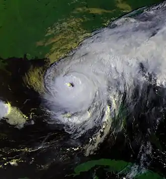 Extrapolation from the storm's eastward progress yielded a projected landfall location near Levy County.[6] However, after the passage of the upper-level system early on August 31, steering currents slackened, and Elena became nearly stationary in the extreme northeastern Gulf of Mexico. At its closest, the center of the storm was around 50 mi (80 km) from Cedar Key, Florida,[2][5] with maximum sustained winds estimated at 105 mph (170 km/h).[7] Elena's intensity remained consistent, and the cyclone was able to continue strengthening as soon as movement resumed. Early on September 1, Elena reached Category 3 major hurricane status.[3] An area of high pressure soon began to build over the eastern United States, causing Elena to slowly retrograde westward.[7] For much of September 1, the center of the hurricane was within range of the WSR-57 radar station in Apalachicola, Florida, enabling extensive study of small features within the eye and surrounding eyewall. During that period of observation, the previously unobstructed eye became cloud-filled.[8]