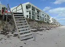After moderate beach erosion from previous hurricanes Dennis and Floyd, Irene caused significant beach erosion on the eastern Florida coastline. The erosion exposed the foundations of private homes, leaving some uninhabitable.[9] Beach erosion damage in east Central Florida totaled to $21 million.[31] Access to many beaches was closed for more sand to be brought in, or until the stairways were rebuilt. Strong north winds and high seas severely destroyed or damaged docks in the Indian River Lagoon.[9] Heavy rainfall, ranging from 5 to 9 inches (127 to 229 mm) in Martin and St. Lucie counties flooded 260 homes. Strong wind gusts from 60 to 70 mph (97 to 113 km/h) severely damaged 34 houses and caused light damage to 1,114 homes in Martin, St. Lucie, and Brevard counties. In addition the winds damaged 465 mobile homes, 15 severely, and destroyed one. A total of 555 commercial buildings also experienced light damage, and gusty winds downed about 1,000 trees. Rough seas broke a large barge free from its mooring into a bridge on Florida Highway 528.[31] Property damage throughout Martin, St. Lucie, Indian River, Brevard, and Volusia counties totaled about $51 million.[32]