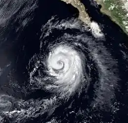 After remaining a marginal tropical storm for 18 hours, Ismael began to deepen and by August 10, it was approaching hurricane intensity.[3] By this time, the storm was forecast to accelerate and approach Guadalupe Island in three days.[2] At 1800 UTC on August 10, Ismael was upgraded into a hurricane. At 0245 UTC the next day, an eye began to form as the system passed east of the outer Revillagigedo Islands.[1] Nine hours later, the EPHC upgraded the storm into a Category 2 hurricane on the Saffir-Simpson Hurricane Wind Scale (SSHWS); simultaneously, the storm reached its peak of 100 mph (160 km/h). At the time of its peak, Hurricane Ismael was located about 400 mi (640 km) west of Cabo San Lucas.[3] Sandwiched between a ridge to the west of the hurricane and a trough off the coast of California, Ismael turned west-northwest and accelerated.[1]