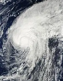 Over the course of October 8, Otto began to accelerate to the northeast under the increasing influence of a vertically deep trough off the US East Coast.[10][16] Conditions aloft remained conducive, and the storm's convection deepened symmetrically over the center to form a large, well-defined central dense overcast.[17][18] By 1200 UTC, Otto's winds had reached 75 mph (120 km/h) while a mid-level eyewall began to form, prompting the NHC to upgrade the storm to a Category 1 hurricane south of Bermuda.[18] Further strengthening ensued as the newly formed hurricane proceeded over the warm waters of the central Atlantic; microwave imagery revealed the eye, though obscured, was vertically well established, marking Otto's peak strength with estimated winds of 85 mph (140 km/h).[19]
