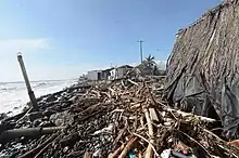 Throughout Jalisco, approximately 9,000 homes were damaged or destroyed.[60] The coastal hamlet of Chamela, home to 40 families, was completely flattened.[61] More than 24,000 ha (59,000 acres) of crops were affected across the state: 10,684 ha (26,400 acres) sustained total losses while 13,943 ha (34,450 acres) were partially so. Damage from agriculture amounted to roughly MX$168 million (US$10.1 million).[62] Total damage reached to MX$1.139 billion (US$68.6 million).[47] A cargo ship—the 735 ft (224 m) bulk carrier Los Llanitos[63]—was shifted off-course by the hurricane and grounded near Barra de Navidad, Jalisco. Her 27 crew were unharmed but required rescue by a military helicopter.[64] The ship was subsequently deemed a total loss and crews began scrapping the vessel on-site in February 2016.[65]
