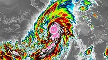 By the early hours of October 23, a clear northward turn took place followed by acceleration northeast.[6] A solid ring of −130 °F (−90 °C) cloud tops surrounded the hurricane's 12 mi (19 km) wide eye and signaled its intensification into a Category 5 hurricane. In a 24-hour time span, Patricia's maximum sustained winds increased by 120 mph (195 km/h), the fastest such intensification in any hurricane observed by the National Hurricane Center (NHC). The hurricane achieved its peak around 12:00 UTC on October 23, with estimated winds around 215 mph (346 km/h) and a barometric pressure of 872 mbar (hPa; 25.75 inHg); these values are based upon continued intensification after a Hurricane Hunter mission into the storm six hours prior. In the NHC's report on Patricia, it is noted that the hurricane may have surpassed Typhoon Tip as the strongest tropical cyclone ever observed, but lack of direct observations at the time of its peak prevents analysis of such.[1]