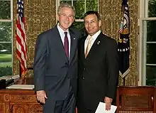 President Bush stands with Ambassador Husain Haqqani of the Islamic Republic of Pakistan, 6 June 2008, in the Oval Office during a credentials ceremony for newly appointed ambassadors to Washington, D.C.