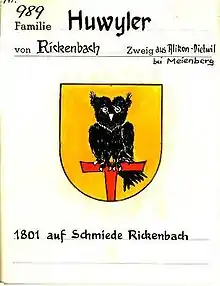 Huwyler is a topographic surname from the Huwyl castle and hamlet located between Römerswil and Hochdorf, Lucerne around the 15th century. The Huwyl area was named as Hunwil in documents dating from 1230 to 1474.[2] The surname started from the Lords von Hunwil (Herren von Hunwil, Giswil OW). The von Hunwil surname is well documented as they were ministerialis barons.[3] In the 15th and 16th centuries, Swiss surnames were derived by appending the syllable –er. This largely replaced the practice of using the "von" prefix. Surname von Hunwil evolved over the years to Huwiler and Huwyler (and even Hauviller in France).
