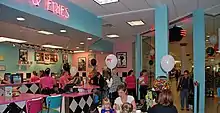 A Hwy 55 restaurant usually has a 1950s theme, with pink-and-teal color accents and '50s decor mounted on the walls.[14] Kitchens are open, whereby customers can watch cooks grill their food.[15][16]