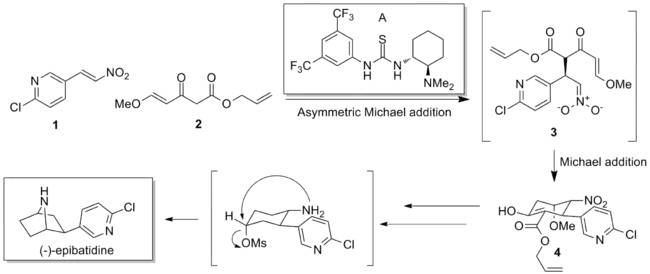 In 2008, Takemoto disclosed a concise synthesis of (−)-epibatidine that relied on a Michael cascade, catalyzed by a bifunctional catalyst.[28] After initial asymmetric Michael addition to the β-nitrostyrene, intramolecular Michael addition furnishes the cyclic ketoester product in 75% ee. Standard functional group manipulations and an intramolecular cyclization yields the natural product.