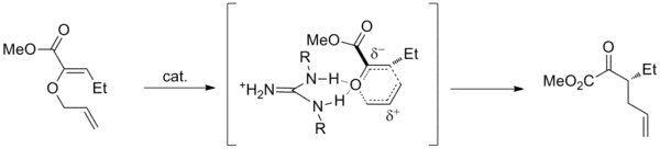 A demonstrative example is the catalysis of Claisen rearrangements of ester-substituted allyl vinyl ethers reported by the Jacobsen research group.[9] A chiral guanidinium catalyst was found to successfully promote the reaction near room temperature with high enantioselectivity. During the transition state, the fragment coordinated to the amidinium catalyst develops partial anionic character due to the electronegativity of the oxygen and the electron-withdrawing ester group. This increases the strength of hydrogen bonding and lowers the transition state energy, thus accelerating the reaction.