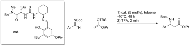 In addition to carbonyls, other electrophiles such as imines can be successfully used. For example, using a simple chiral thiourea catalyst, the asymmetric Mannich reaction of aromatic imines with silyl ketene acetals can be catalyzed with high ee in near quantitative conversion.[6] The mechanism of this reaction is not fully resolved and the reaction is very substrate-specific, only effective on certain aromatic electrophiles.